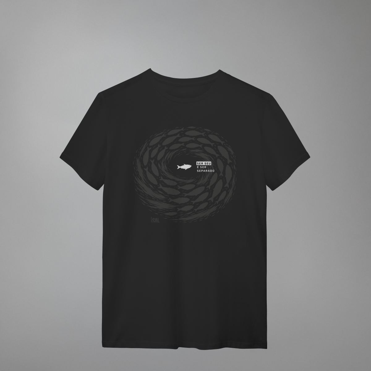 A estampa apresenta um único peixe em contraste com o cardume, simbolizando identidade, chamado e posicionamento espiritual. Ser Seu é escolher viver guiado por valores eternos, mesmo quando o fluxo aponta para outra direção.